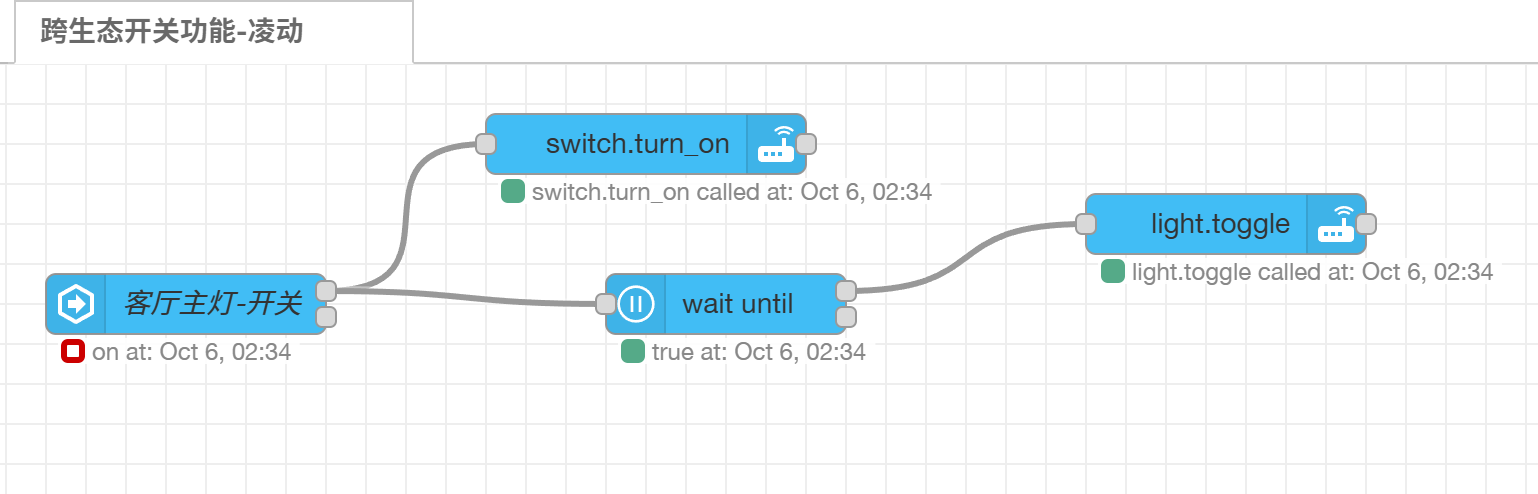 所以在NodeRed中,增加一个状态监控. 当开关被关闭,触发开关再次打开.开关再次打开的时候,去切换灯具的状态即可.